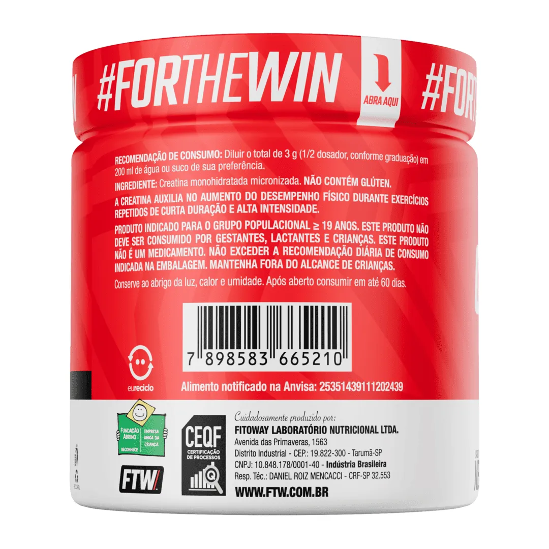 Creatina FTW é suplemento alimentar em pó à base de creatina monohidratada micronizada. Pode ser utilizado por pessoas adultas como parte de uma rotina alimentar equilibrada e associada à prática de atividade física.
